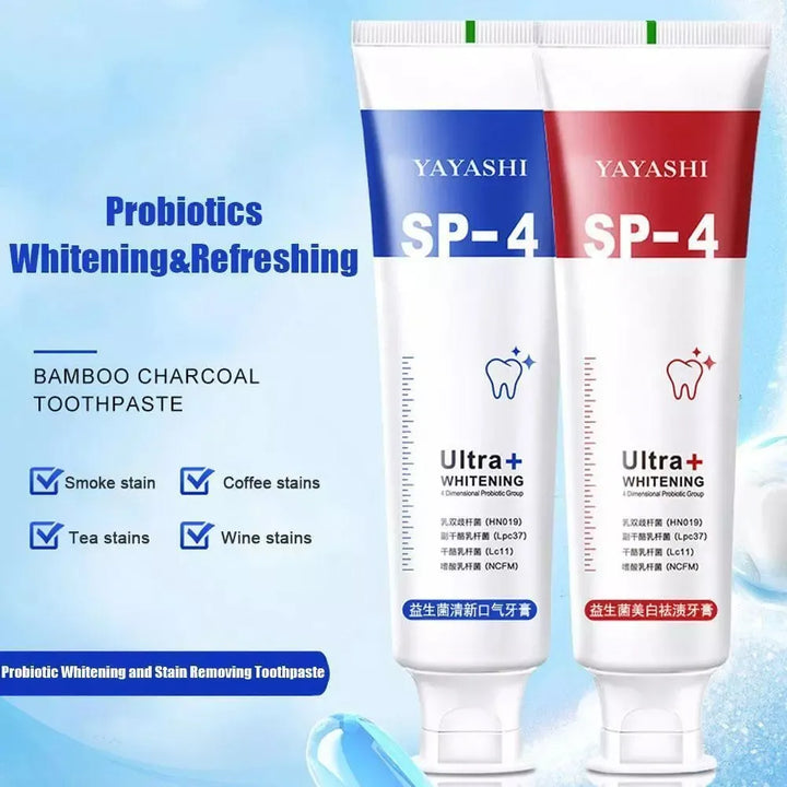Tired of dull, stained teeth? Our SP-4 Probiotic Whitening Toothpaste is specially designed to remove years of discoloration caused by coffee, tea, wine, and smoking—revealing a brighter, whiter smile!